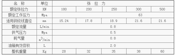 產品介紹: 礦用氣動錨索張拉機具具有體積小、重量輕、攜帶方便、操作簡單、使用安全等特點。氣動油泵的特點是有單柱塞做功,進氣量大,換向速度快,排油量大,能在短時間內達到規定壓力,這樣既提高了效率,又減少了工作阻力。 礦用氣動錨索張拉機具是煤礦用錨固預應力錨索的必備機具。本產品分別適用于 GB/T5224-2003 規定的高強度低松弛鋼絞線的錨固。 主要參數: